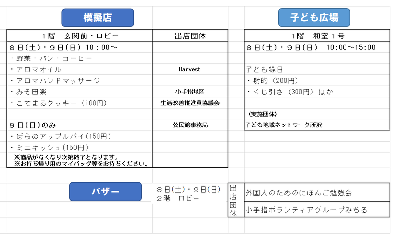 模擬店(ピロティ・1階ロビー)・バザー(2階ロビー)・子どもひろば(1階和室)