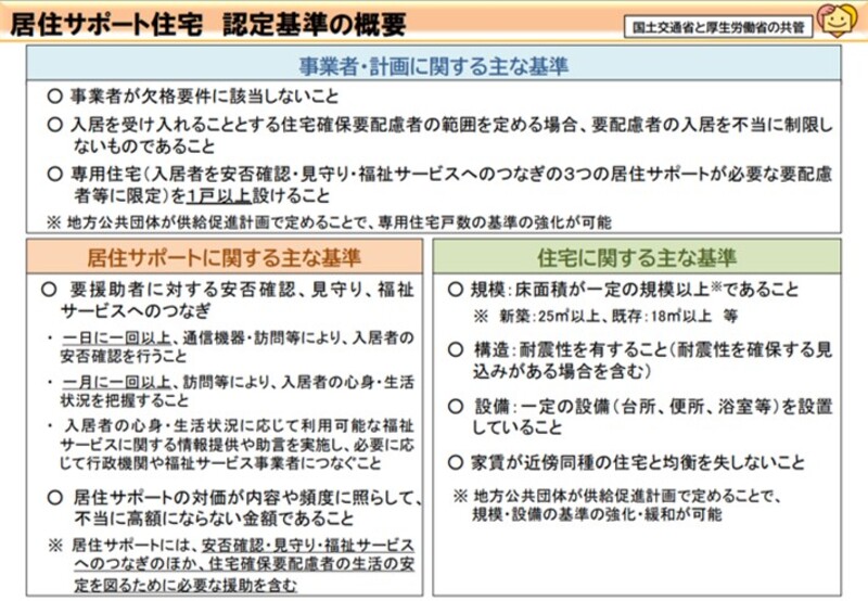 居住サポート住宅は、居住安定援助賃貸住宅事業に関する計画(居住安定援助計画)を、福祉事務所が設置されている市区町村等が認定する制度となっており、主な認定基準として、居住サポート(ソフト)に関する基準と住宅(ハード)に関する基準が設けられています。