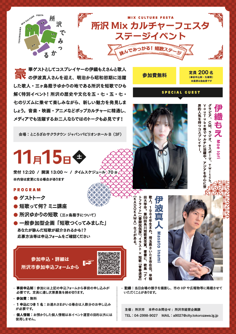 11月15日(土曜)に開催する所沢Mixカルチャーフェスタ(愛称:みっかる)は、コスプレイヤーの伊織もえさんと歌人の伊波真人さんとともに、明治から昭和初期に活躍した歌人・三ケ島葭子ゆかりの地である所沢を短歌でひも解くイベントとして実施します。