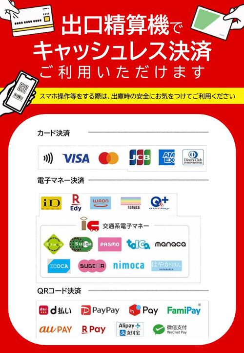 令和7年10月11日(土曜)より出口精算機では、キャッシュレス決済の利用が可能となりました。