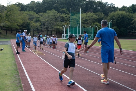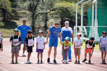 交流会では、地元の小学生がコーチ陣からミニハードルを使っての走り方の指導があり、最後にはゴールドメダリストと一緒に競走をして親交を深めていました。