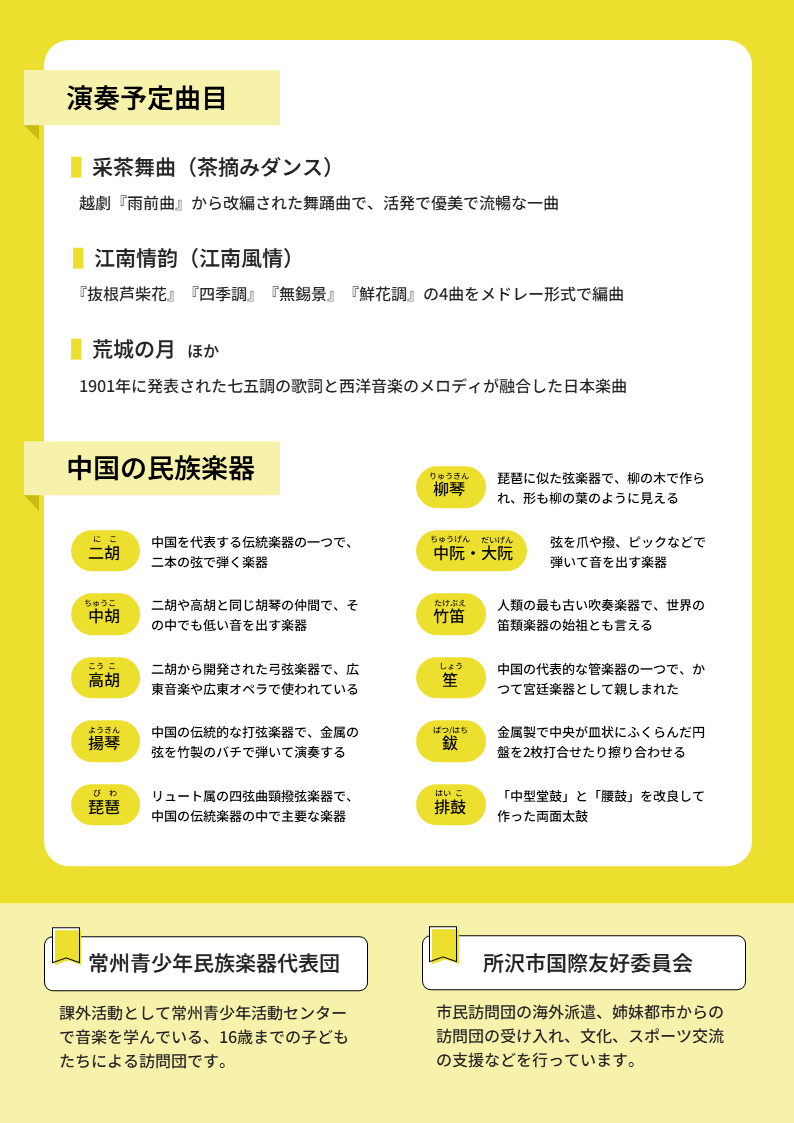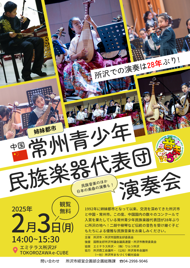 平成4年(1992年)に所沢市と姉妹都市となって以来、交流を深めてきた中国の常州市。この度、28年ぶりに常州青少年民族楽器代表団が来訪します。