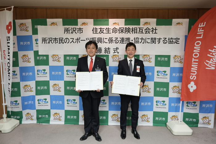 所沢市と住友生命保険相互会社は、相互に連携及び協力を行い、市民のスポーツ振興に向けた取組みを通じて、市民のより一層の健康的な生活の実現を図ることを目的に「所沢市民のスポーツ振興に係る連携・協力に関する協定」を締結しました。