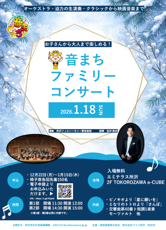 音まちファミリーコンサートは、子どもたちやその保護者等にとって身近な場所でコンサートを開催することにより、気軽にクラシック音楽等に触れる機会を創出するイベントです。今回は、所沢フィルハーモニー管弦楽団(外部サイト)による、オーケストラの演奏をお届けします。