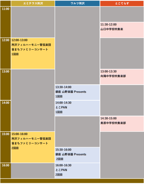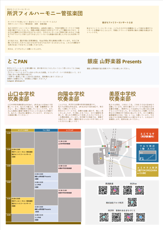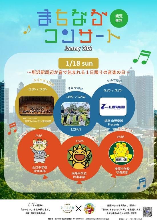 出演アーティストは、所沢フィルハーモニー管弦楽団をはじめ、市内中学校吹奏楽部(山口中学校、向陽中学校、美原中学校)、とこPANの皆さまです。また、銀座 山野楽器 Presentsがお送りする音楽ステージもお楽しみいただけます。