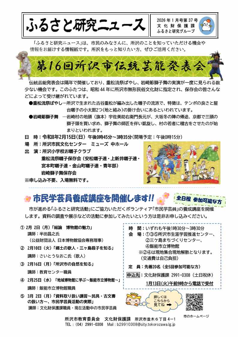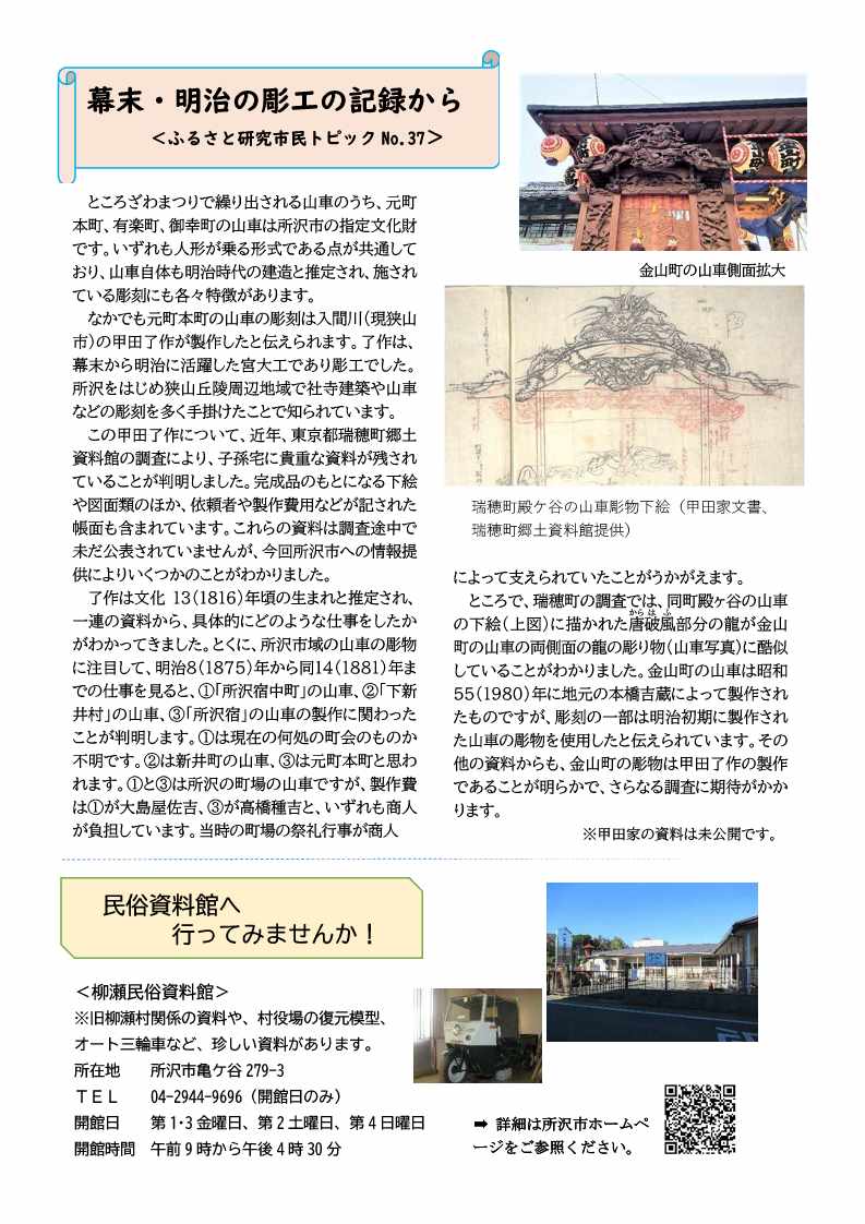 「ふるさと研究ニュース」第37号を発行しました。隔年開催の伝統芸能発表会、市民学芸員養成講座のご案内、ところざわまつりの山車の彫工の話題などのご紹介です。