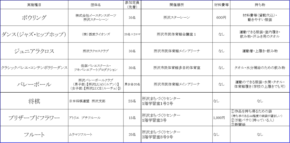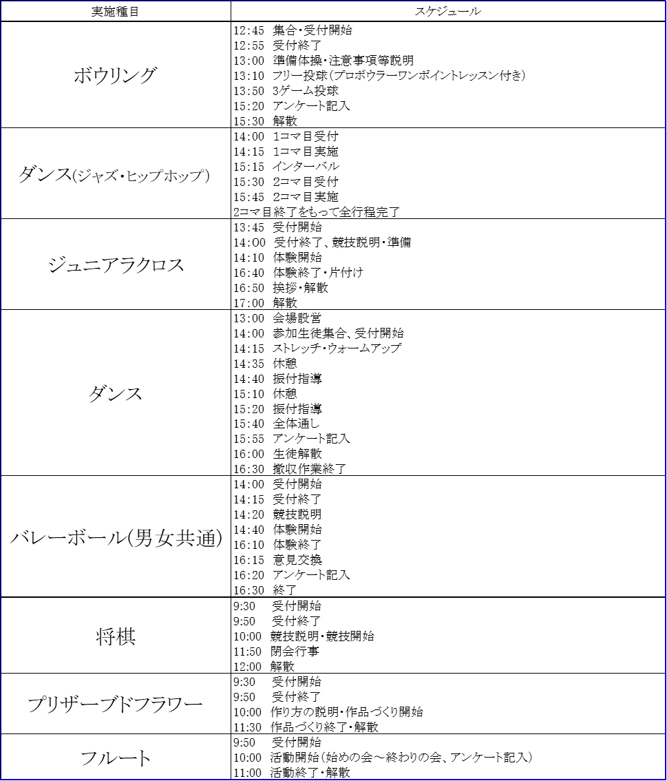 ボウリング、ダンス(ジャズ・ヒップホップ)、ジュニアラクロス、クラシックバレエ・コンテンポラリーダンス、バレーボール