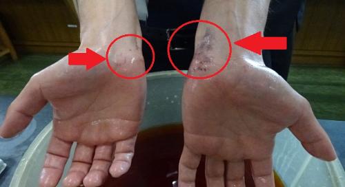 洗った手を5秒間ヨウ素溶液に浸す ※アレルギーに注意が必要です。