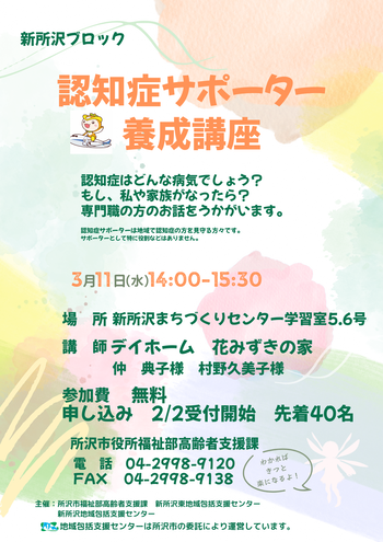 | 3月11日 | 水曜 | 14時から15時30分 | 新所沢まちづくりセンター | 40名 | 2月2日 | 申込み・問合せ 所沢市高齢者支援課(電話:04-2998-9120) |