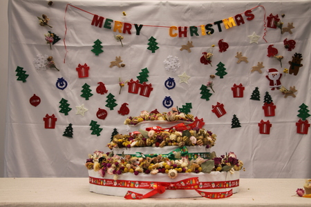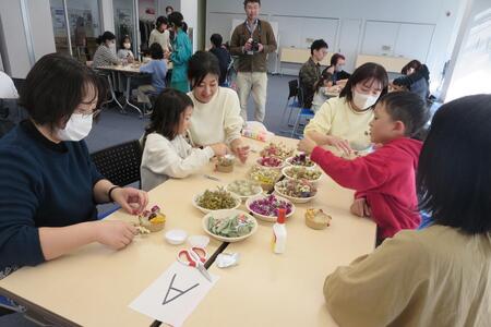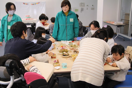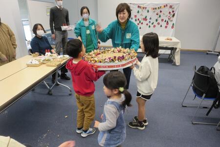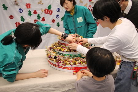 ワークショップには、身体障害のある方、知的障害の方も参加され、たくさんの花材の中から好きなものを選び、思い思いのケーキを作成した後、参加者全員で協力し、大きなクリスマスケーキを完成させました。