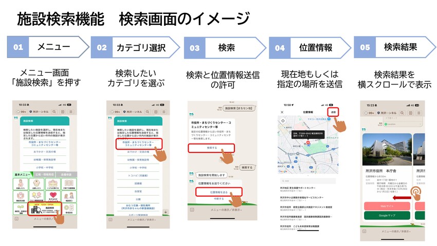 所沢市公式LINE「所沢市こども・若者情報チャンネル」では、令和7年12月24日より、現在地または指定した位置情報からお近くの施設を検索することができる、「施設検索機能」がスタートしました。市内の施設をお調べの際に、ぜひご活用ください。