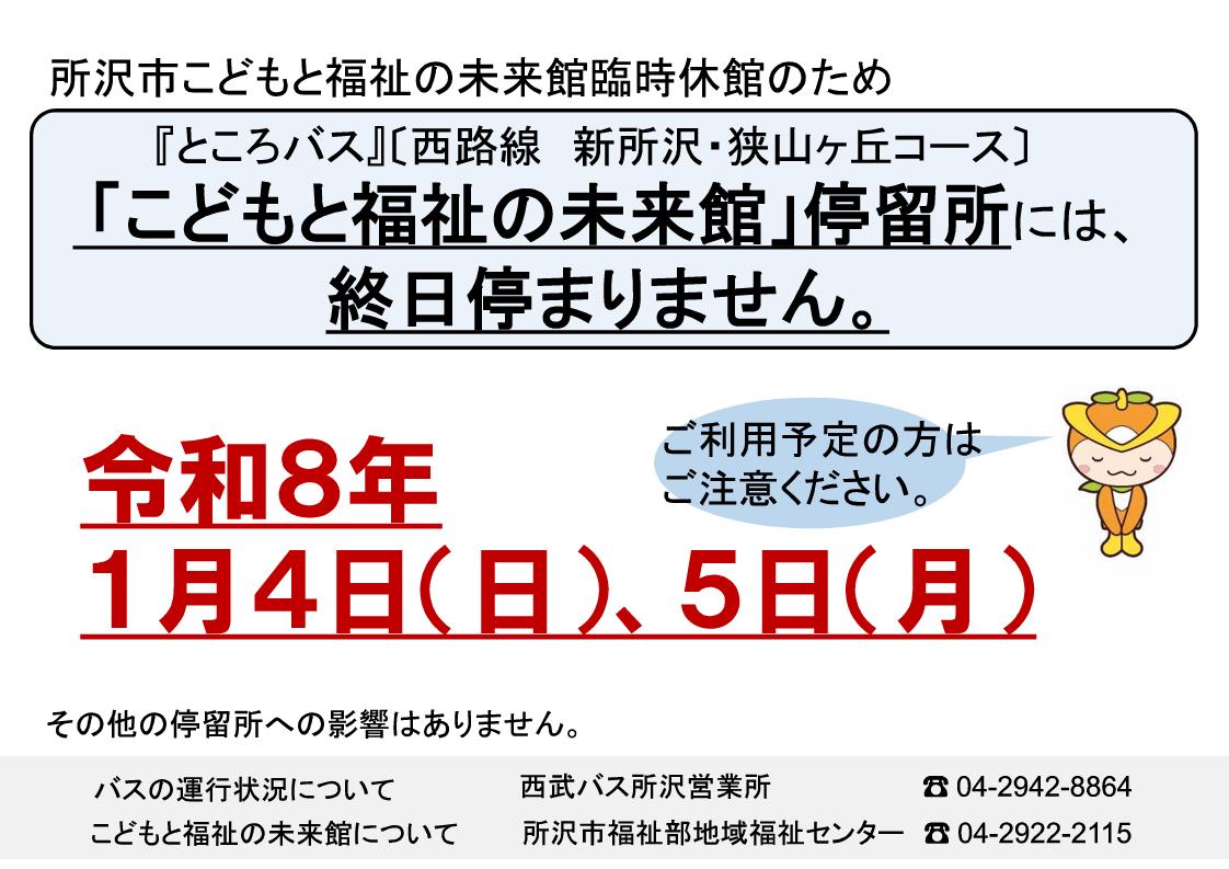 「こどもと福祉の未来館」の臨時休館となります。ところバス西路線(新所沢・狭山ヶ丘コース)の「こどもと福祉の未来館」停留所は終日迂回となり、停まりません。ご利用予定の方はご注意ください。なお、その他の停留所への影響はありません。