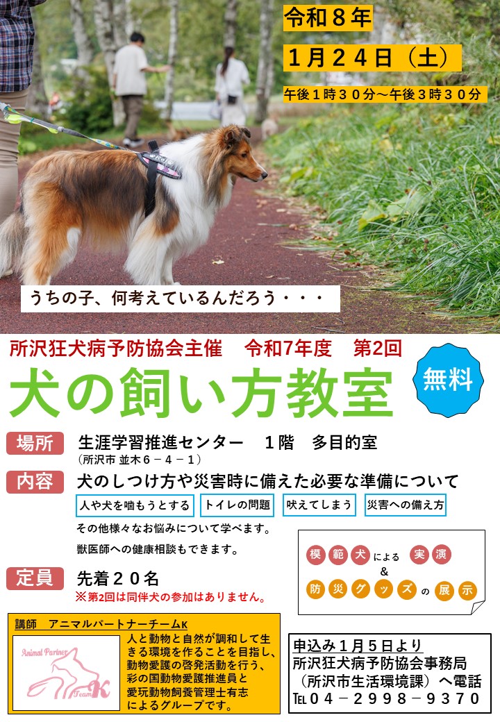 犬の行動で困っている、どのようにしつけていいかわからない、犬の健康面で気になることがある、といったことはありませんか。また、新しく犬を飼い始めたばかりであったり,これから飼うことを検討しており、参考に話を聞きたい方などでも大丈夫です。災害時に備えた、飼い主様にとって必要な準備等もご確認いただけます。どなたでもお気軽にご参加ください。
