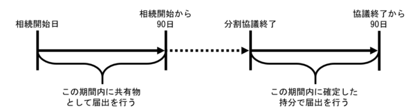 相続において、相続開始の90日以内に分割協議が調わない場合には、相続開始の日から90日以内に法定相続人の共有物として届出を提出する必要があります。