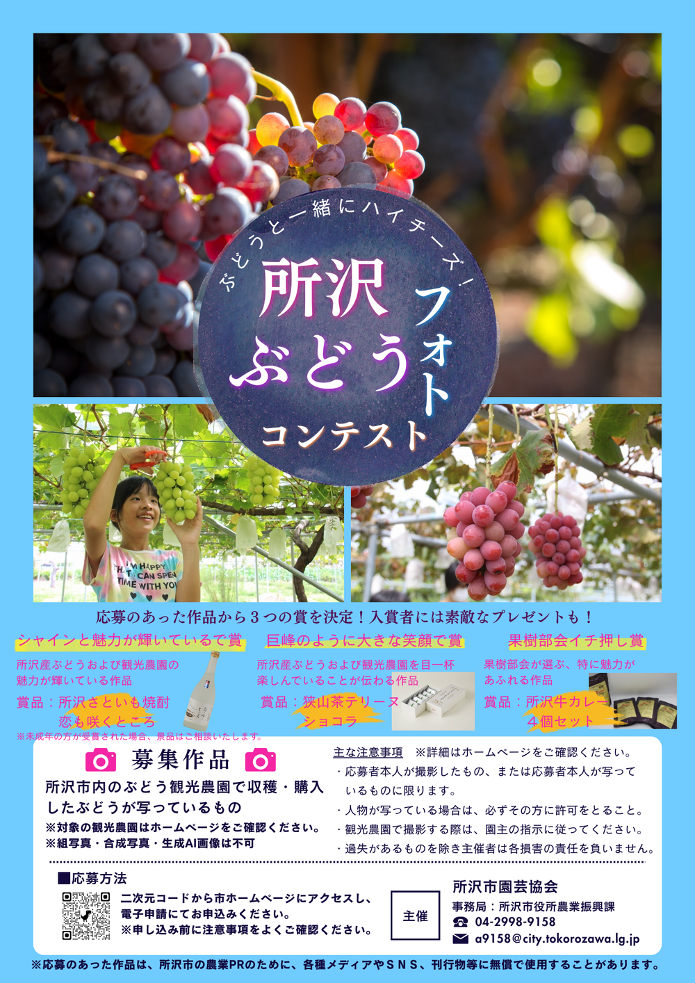 応募作品の著作権は撮影者に帰属しますが、使用する権利は園芸協会に帰属するものとします。応募のあった作品およびそのタイトル、撮影日時、撮影した観光農園の情報は、ぶどうをはじめ所沢市の農業および観光農園の周知、フォトコンテストの開催周知のために、各種メディアやSNS・刊行物等に無償で使用することがありますのであらかじめご了承ください。