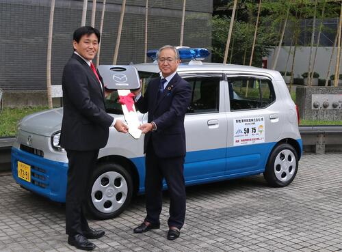 東明興業株式会社様から、青色回転灯パトロール車(通称、青パト)の寄附がありました。この青パトは、地域の安全を守るため、市内を巡回するパトロール活動に使用されます。ご支援をいただき、誠にありがとうございました。