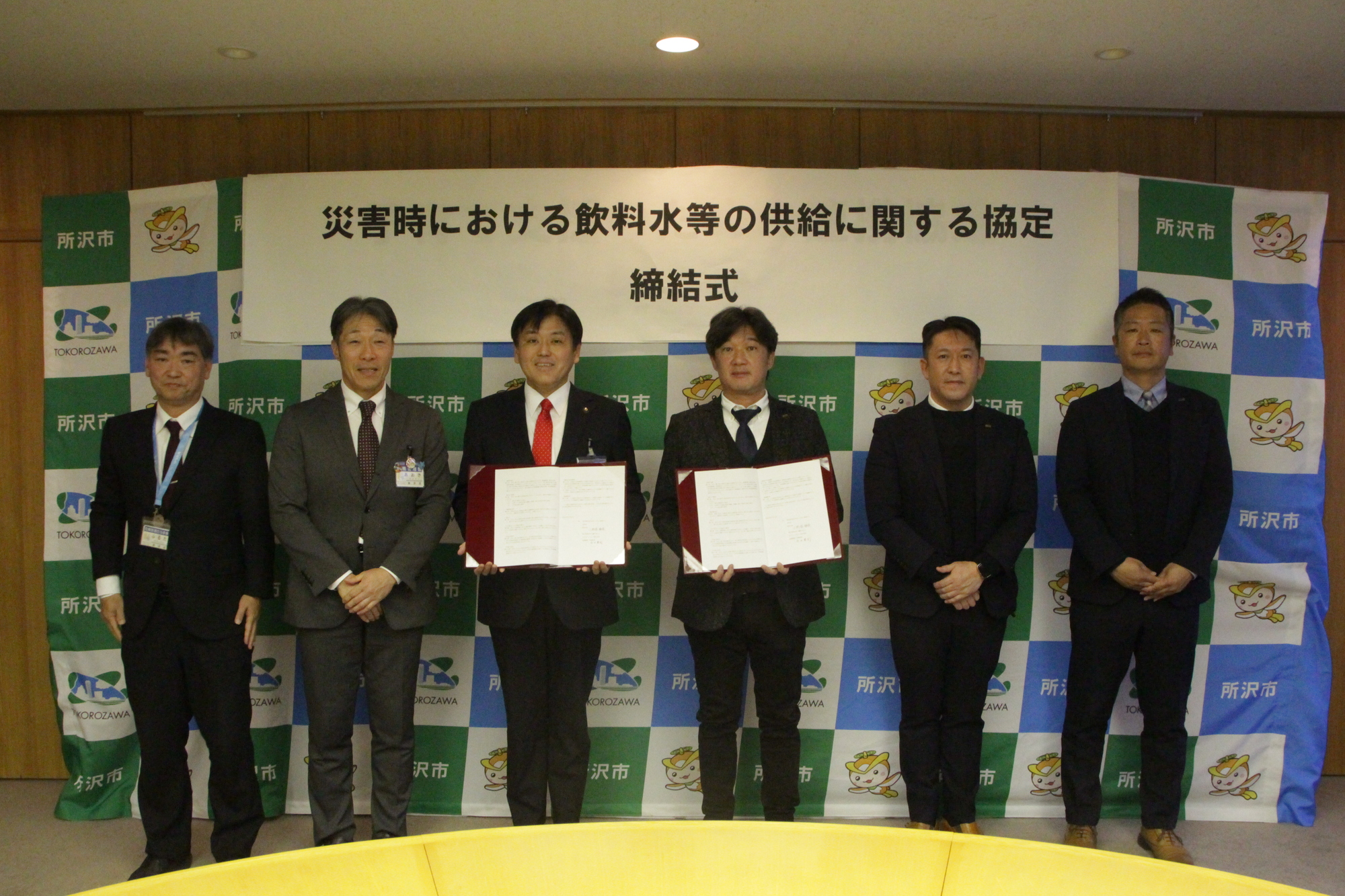 (写真左から)所沢市 危機管理担当参事 古田晃一、危機管理監 青木一圭、所沢市長 小野塚勝俊、ダイドードリンコ株式会社 首都圏第二営業部長 吉田勝則、首都圏第二営業部 埼玉オフィス 課長 松崎貴志、首都圏第二営業部 埼玉オフィス リーダー 三國良輔