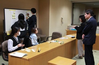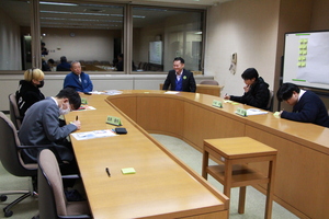 委員会室で議員と学生で、テーマについてグループディスカッションを行いました。