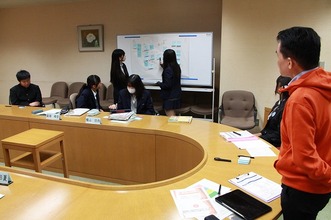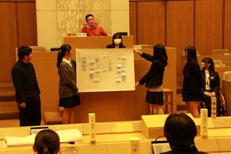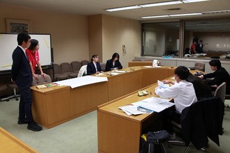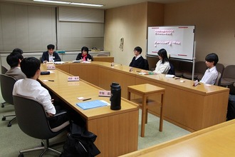 委員会室で議員と学生で、テーマについてグループディスカッションを行いました。