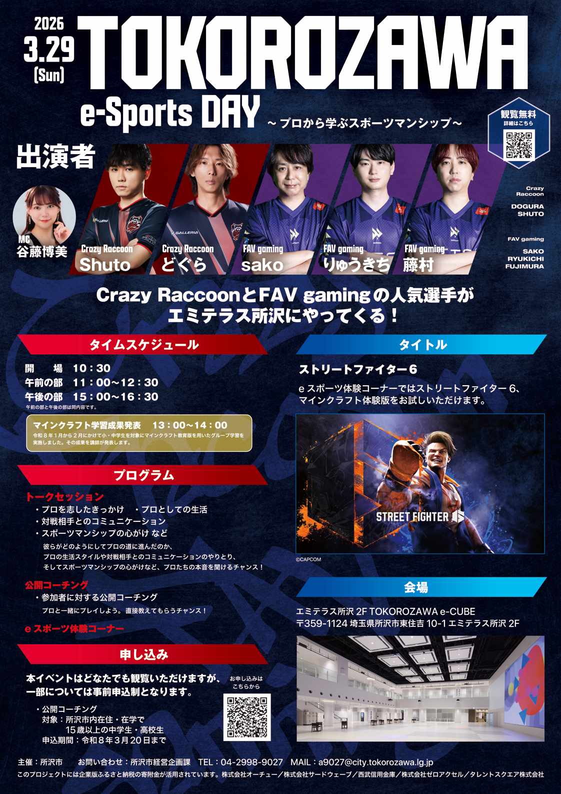 令和8年3月29日(日曜)にエミテラス所沢にて、「TOKOROZAWA e-Sports DAY~プロから学ぶスポーツマンシップ~」を開催します。