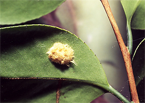 卵は、葉の裏側などに黄色で毛玉状のものを密集して産み付けます。