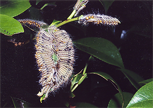 孵化した幼虫は、葉の裏側で頭をそろえて密集し、表皮を残しながら葉を食べます。成長するにつれ、枝や幹、周辺へ移動をし始めます。