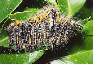 体の表面に毒針毛を持っており、肌に触れると強いかゆみやかぶれ等を引き起こします。生垣等に発生すると通行する人に被害が及ぶため、発生した場合には早期の駆除が必要です。