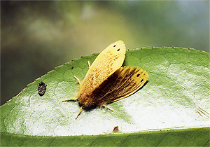 成虫は、2センチメートルほどの黄褐色のガで、灯火を求めて家の中に飛来することもあります。