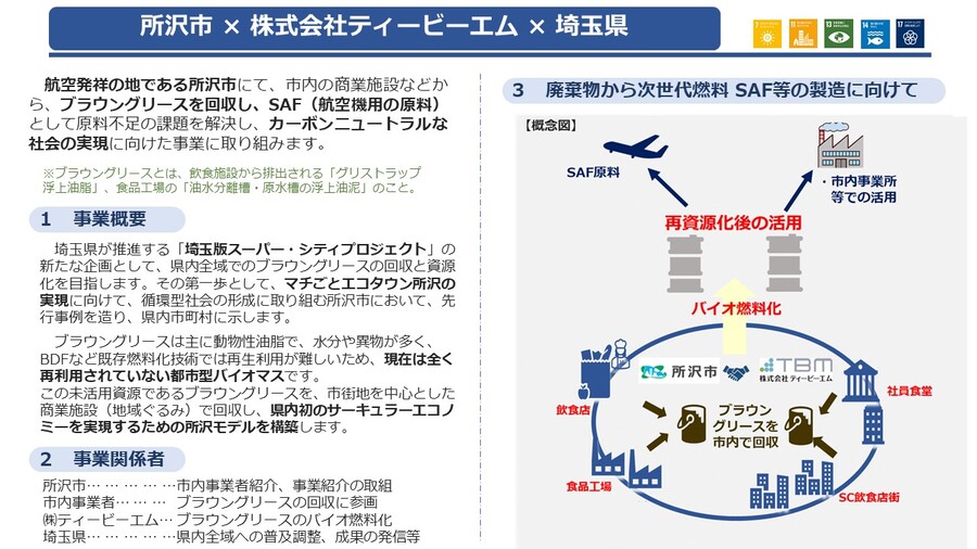 本協定の締結により、本市は市内事業者の紹介を行い、日本の航空発祥の地である所沢から世界へと飛び立てるよう地域ぐるみでブラウングリースの回収・資源化「所沢モデル」を構築することで、廃棄物の減量及び二酸化炭素排出量を削減し、資源循環型社会の実現に貢献します。
