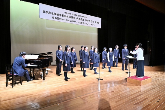 この講演会は、所沢市制施行75周年と戦後80年の記念事業として、次世代へ平和の尊さを継承するために開催されました。令和6年にノーベル平和賞を受賞した日本原水爆被害者団体協議会の代表委員である田中煕巳氏から、13歳で経験した長崎での被爆体験や、核兵器廃絶への歩みについてお話いただきました、また、会場では埼玉県立芸術総合高等学校の合唱部による合唱も披露されました。