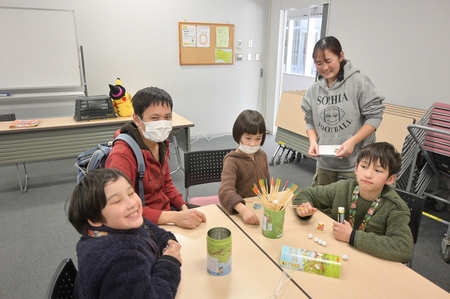会場の近くに工場があり、BUTTERFLY(バタフライ)のブランドで高品質なラバーやラケットが選手から愛用され、世界的に高い評価を得ている株式会社タマスの方々や、学生のボランティアの方々にご協力いただきました。30人の定員を大幅に超える40名のこどもたちが参加。それぞれ好きな絵をラケットに書いて、グリップをボンドで張り付けて完成。作ったラケットを手に、「卓球のラケットは木でできており、自然を守ることも考えてほしい」という、講師の方の話に耳をすましていました。ラケットをつくった後は、卓球体験を行いました。初めての子も多く、スマッシュで的を射抜くことができると、皆で声を出して喜んでいました。