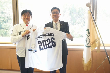面会では、2026年度の開幕にあたり、2026の背番号とTOKOROZAWAの刺繍が入ったユニフォームが贈呈され、早速市長も着用しました。